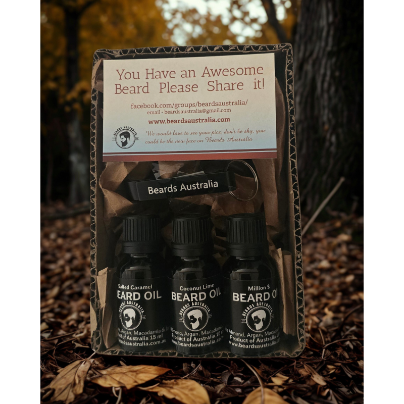 Pack of 3 bottles, 15ml each. The lightweight Beard Oil will help soften and nourish the follicles on the skin & beard. Our beard oil is locally sourced, hand-poured in Australia, and packed full of natural ingredients containing Almond, Argan, Macadamia & Jojoba oils. Our signature fragrance is Million $, very classy. Salted Caramel is sickly sweet & Coconut lime smells like an island paradise. Here at Beards Australia, we pride ourselves on using the best natural oils available to moisturize & help keep your facial hair healthy. Warning – These fragrances are the most seductive scents according to females.